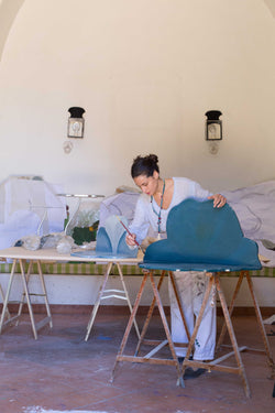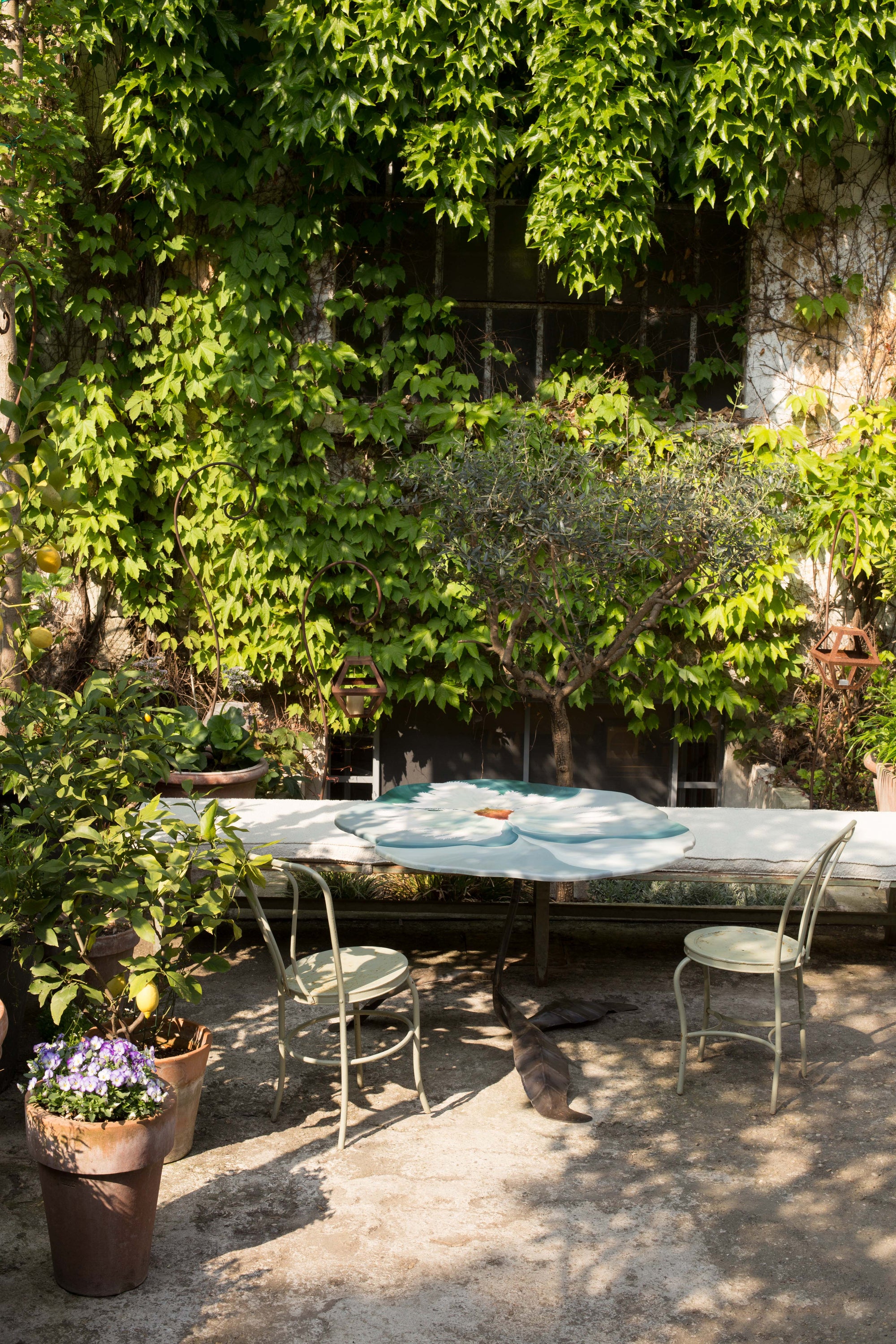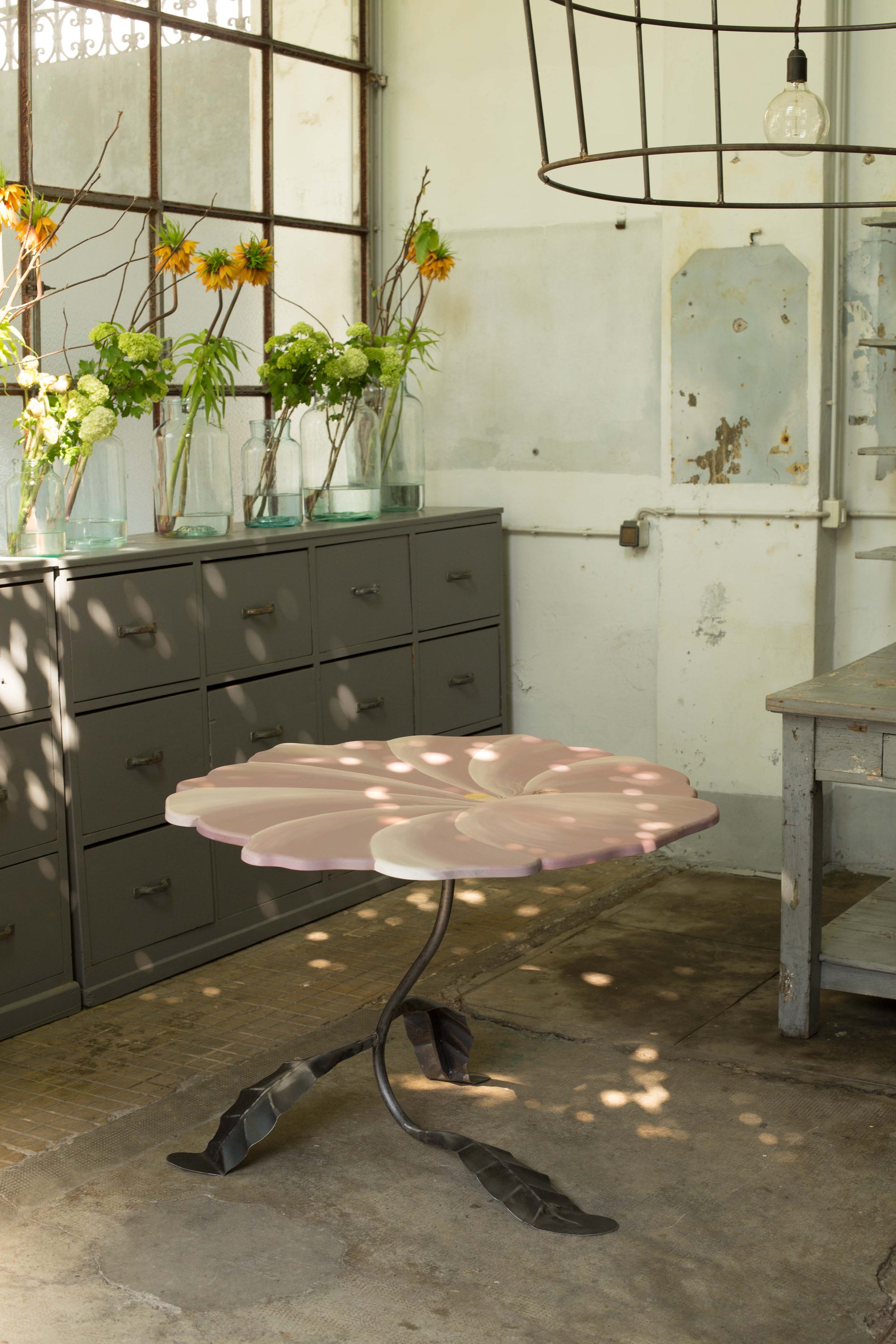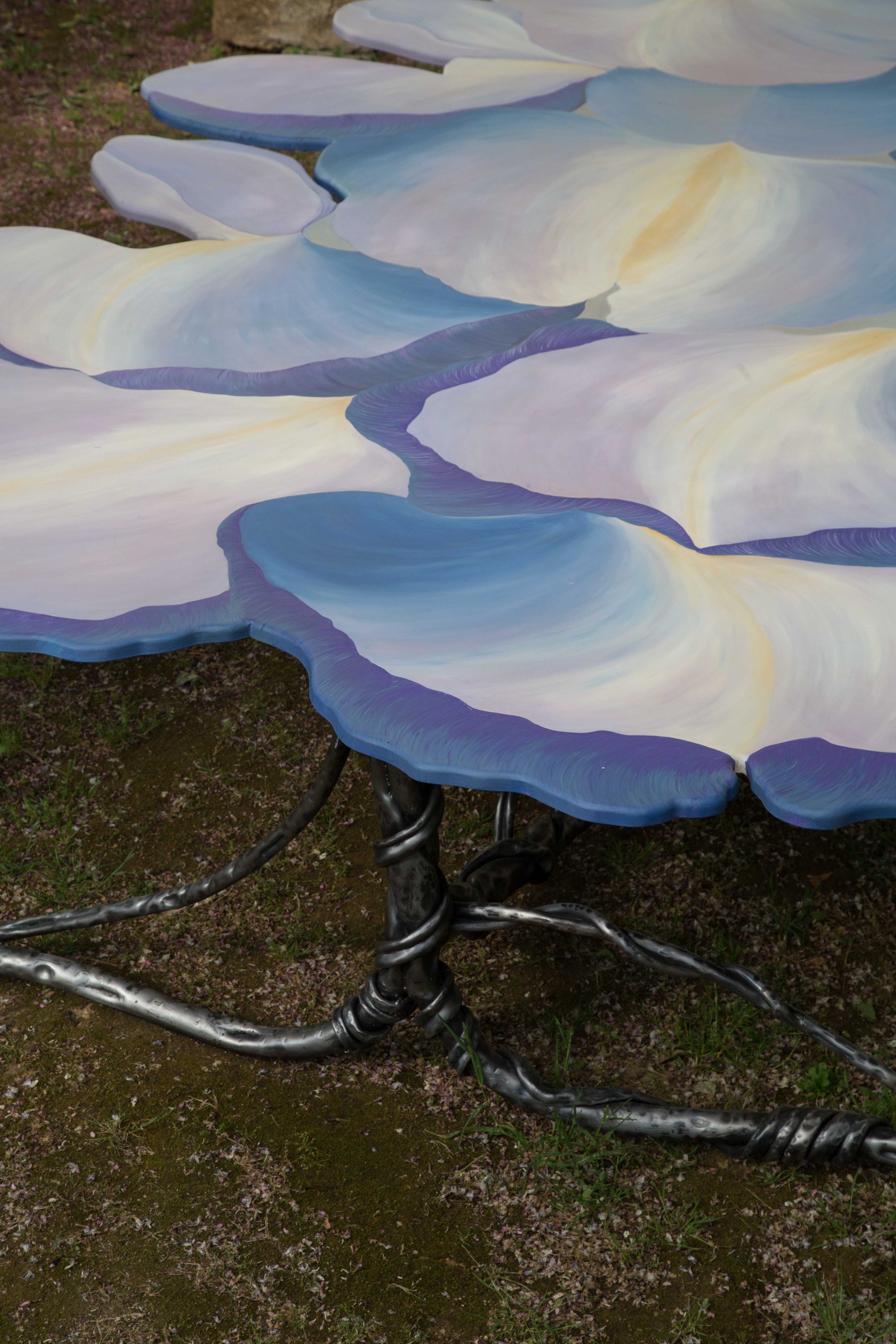 Victoria Episcopo became a furniture designer entirely by accident. After writing a thesis on contemporary art in Mexico for six months, she got the news that her beloved grandma had died. Episcopo returned to her grandparents’ house in Salento, Puglia, just in time for Christmas, and walked into her grandmother’s now-vacant studio. “I found the top of the tables white, ready to be painted,” she says. “So I thought to myself, ‘Let's try to do it.’” Her grandmother had loved to paint in the 1970s — particularly on flower-shaped tables made of wood and wrought iron, and now, it was Episcopo's turn to take up the reins. First, she painted small, characterful side tables mimicking different-coloured lilies. Thanks to iron’s incredible malleability, Episcopo made the legs of the tables look like plant stems with leaves as dainty feet. “I like to give the impression that the leaves of the table can move. I call them ballerina's feet,” she says. If you look closely enough, you can also see minute, almost microscopic detail of wasps and bees pollinating the flowers, while the surfaces of the tables themselves appear three-dimensional thanks to painterly optical illusions.