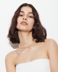 Our short beaded necklace features Florentine Finish 18k Gold beads strung on an 18k Gold chain. The beads are irregularly spaced to allow for movement and visibility of the chain.
