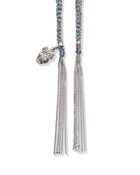 This Lucky necklace features an 18k gold diamond-cut chain, hand-braided with purple and turquoise silk and finished with an owl charm symbolising Intuition.